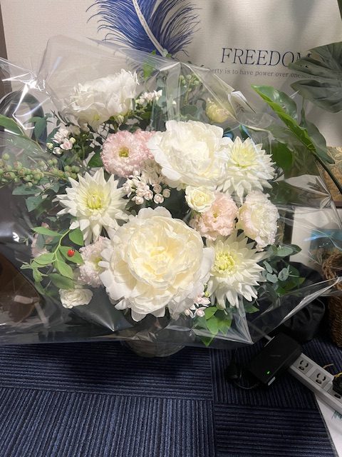 開業のお祝いに、思いがけず大きなフラワーアレンジメントをいただきました。