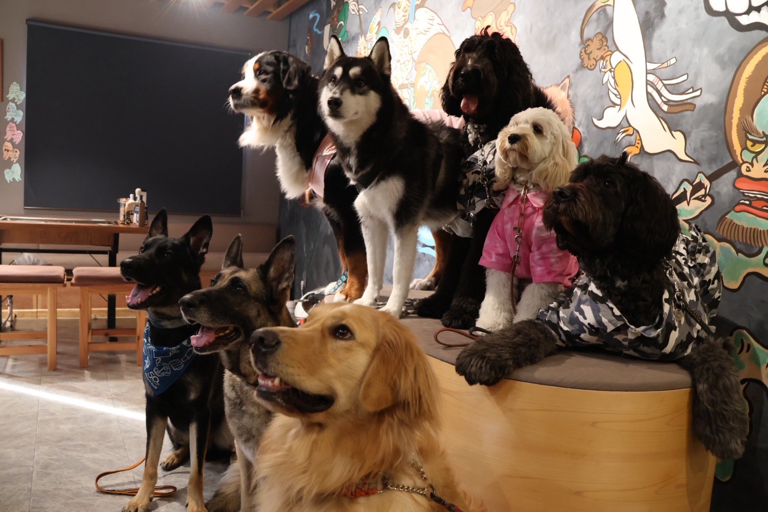 お店では、マナートレーニングがばっちりなラン仲間たちと一緒。