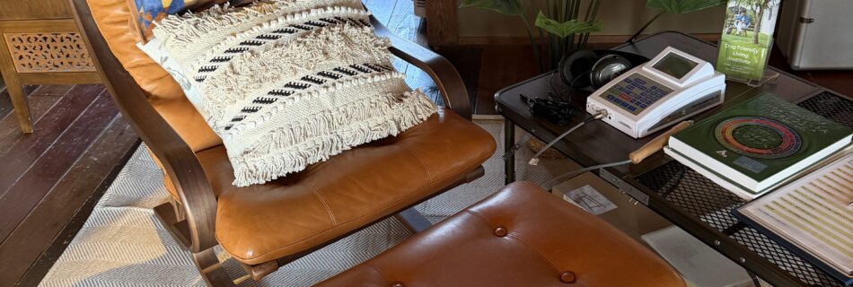 サロンに入ってまず目に入るのが、木の温もりとやわらかな曲線が美しいソファ。ここは、お客様がバイオレゾナンスの施術を受けるための、特別な場所です。 このソファの名前は 「Agio(アギオ)」。富士ファニチアという日本の老舗 …